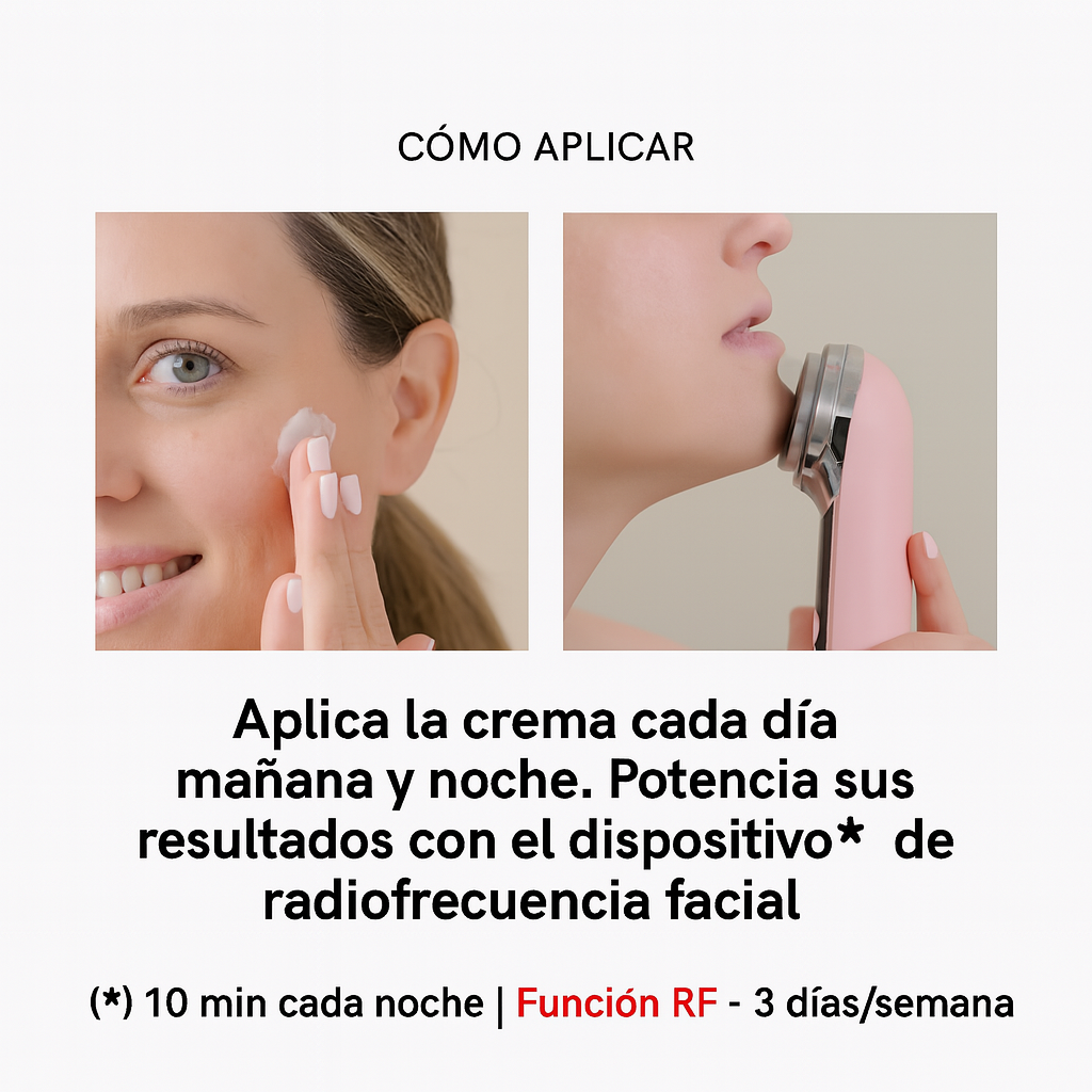 Aplica tu crema o sérum favorito y desliza el dispositivo por el rostro limpio durante 10 minutos. Se recomienda usarlo 3 veces por semana con la función RF (radiofrecuencia) para mejores resultados.