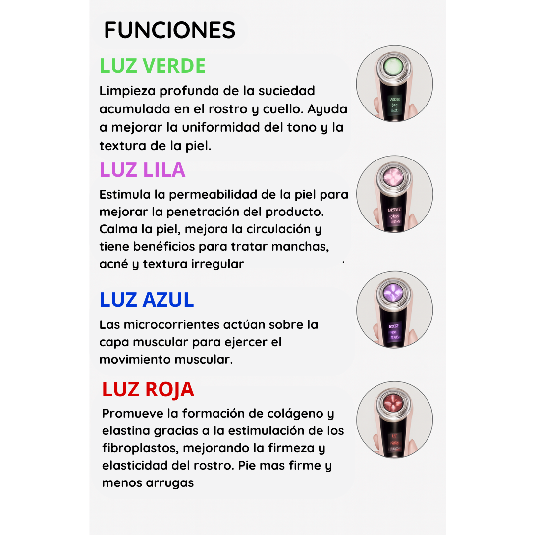 Incluye luz LED en 4 colores, cada una con beneficios específicos: limpieza profunda, mejor absorción de productos, tonificación muscular y estimulación de colágeno.